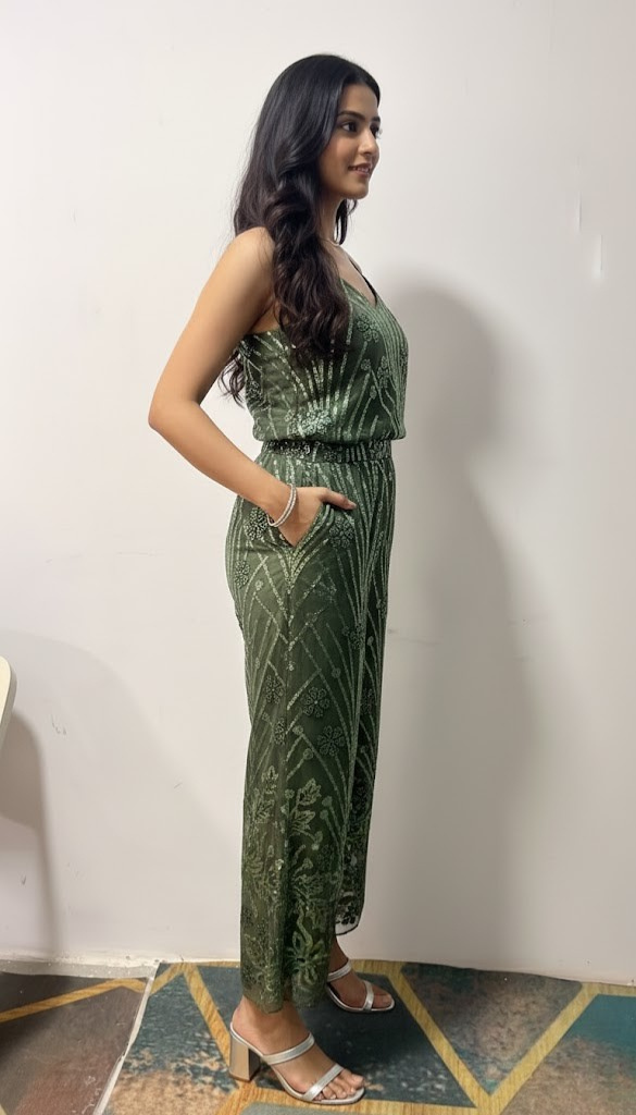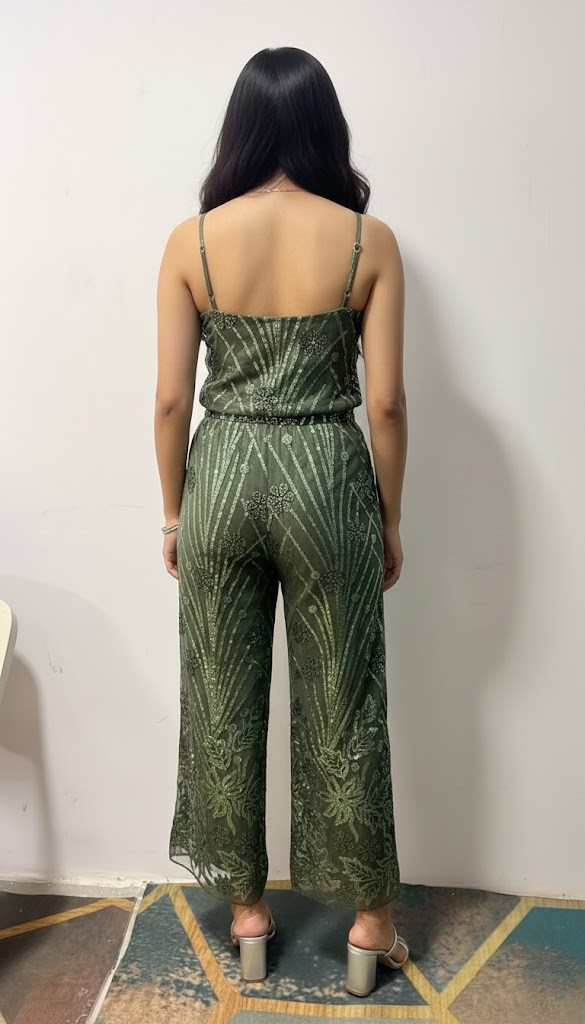 Introducing the elegant Emerald Mesh Embellished Lounge Wear. This statement piece boasts a chic silhouette with delicate spaghetti straps and a breathable mesh overlay that is lavishly embroidered with tone-on-tone sequins. The gathered, defined waist ensures a flattering fit, leading to a comfortable, slightly cropped wide-leg trouser. The deep olive/emerald hue adds a touch of sophisticated glamour, making it an ideal alternative to a dress for any upscale evening occasion.