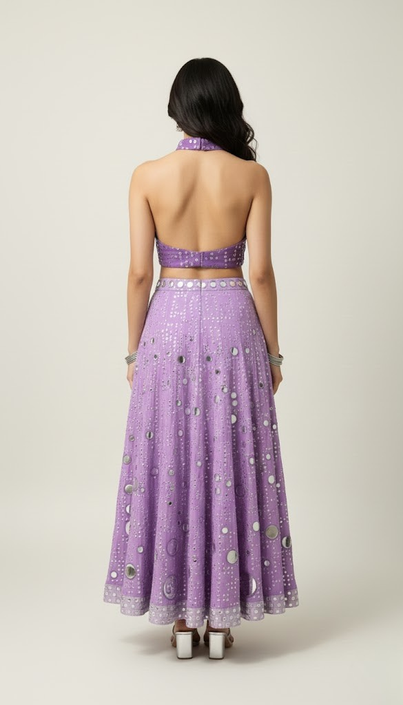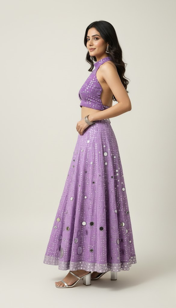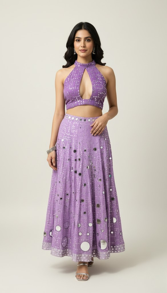Make a dazzling entrance in the Lilac Disco Mirror Lehenga Set. This stunning fusion ensemble features a high-neck crop top with a daring keyhole cutout and intricate all-over sequin and bead embellishments. The breathtaking lilac maxi skirt is adorned with large, contemporary mirror-work circles and delicate thread embroidery. Designed to catch the light from every angle, this set offers a modern, glamorous take on traditional wear, perfect for Sangeets, Mehendi ceremonies, or festive parties.