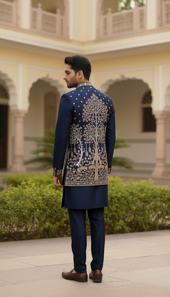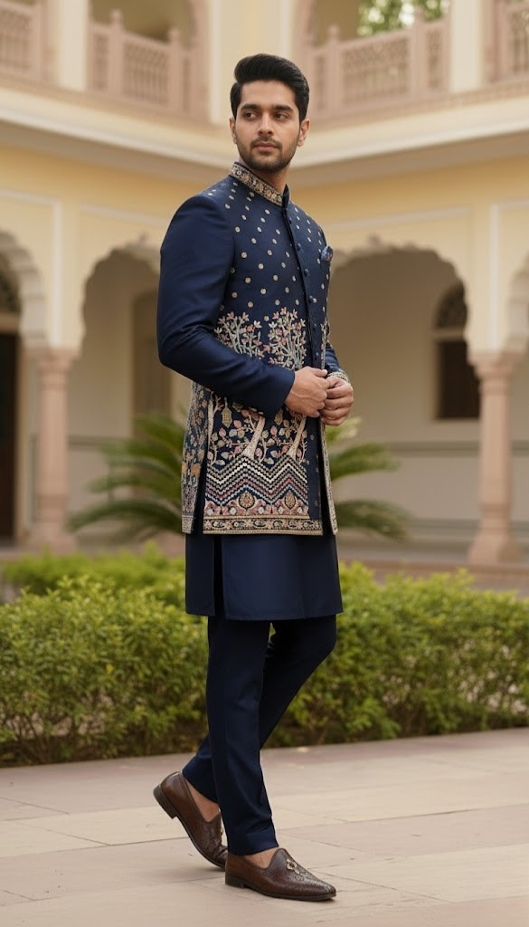 An exquisite sherwani in rich midnight blue, adorned with intricate heritage embroidery and regal borders—crafted for moments of prestige and distinction.