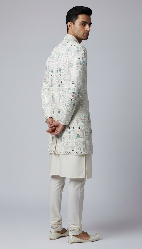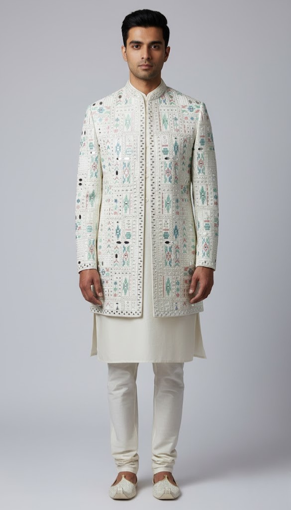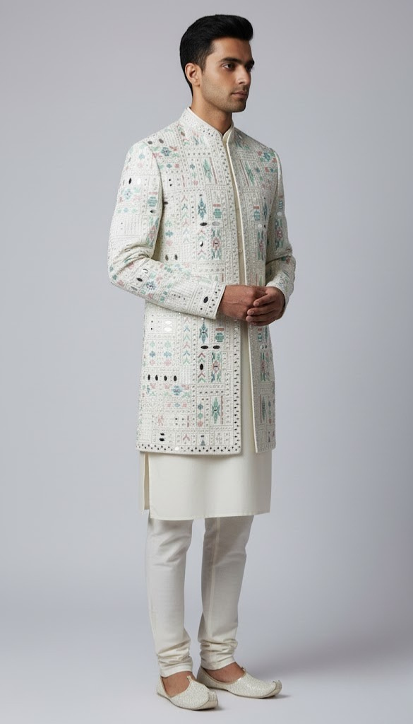 The Alabaster Mosaic Indo-Western Set: A classic, refined silhouette perfect for sophisticated celebratory events. This outfit features a softer color palette and intricate embroidery. The ensemble is adorned with a delicate mosaic of pastel threadwork in sage and dusty rose, interspersed with reflective mirror accents. This contemporary piece bridges traditional craftsmanship with a modern aesthetic, offering a fresh and light-filled look for high-profile daytime or evening occasions. Color: Off-White / Ivory / Pearl Fit: Tailored slim fit