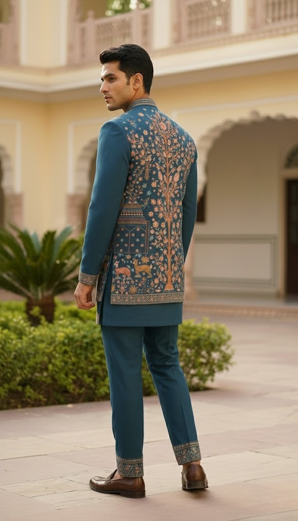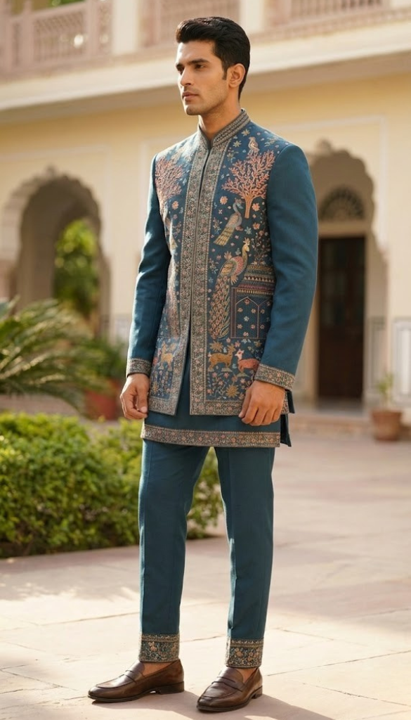 The Peacock Azure Bandhgala Set: A modern take on regal heritage. This waist-length jacket features a striking symmetrical composition of peacocks, floral trees, and forest life. The dense, multi-colored threadwork is set against a vibrant blue backdrop, framed by detailed borders on the placket, collar, and cuffs for a sharp, majestic finish.