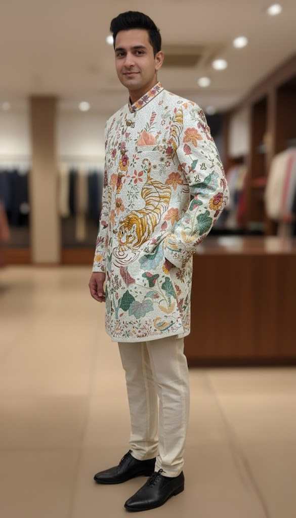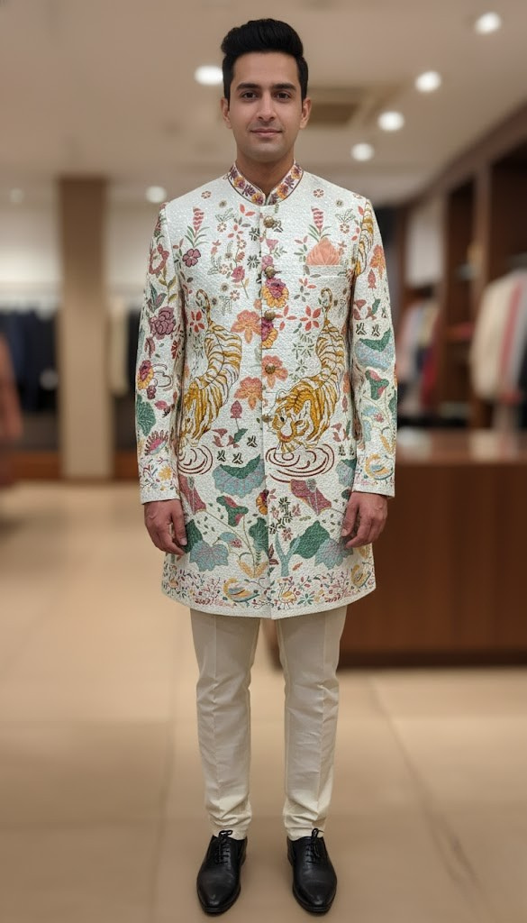 The Royal Bengal Indo-Western Set: A classic, refined silhouette perfect for sophisticated celebratory events. This outfit features a softer color palette and intricate multi-colored embroidery. The ensemble is anchored by a majestic “Shikargah” motif, showcasing two powerful tigers amidst a lush, embroidered forest of lotus blooms and wild greenery. Detailed with vibrant threadwork in shades of saffron, sage, and crimson, this piece is a bold celebration of Indian heritage and power.
