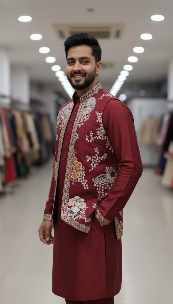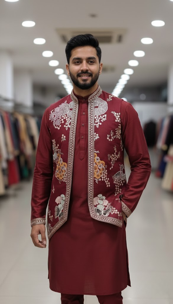 • Key Detail: High-contrast resham and zari embroidery on a premium deep-maroon base