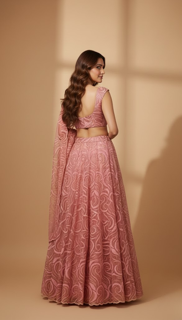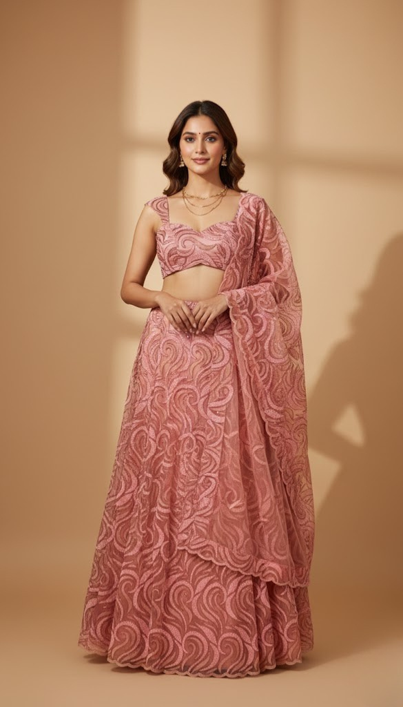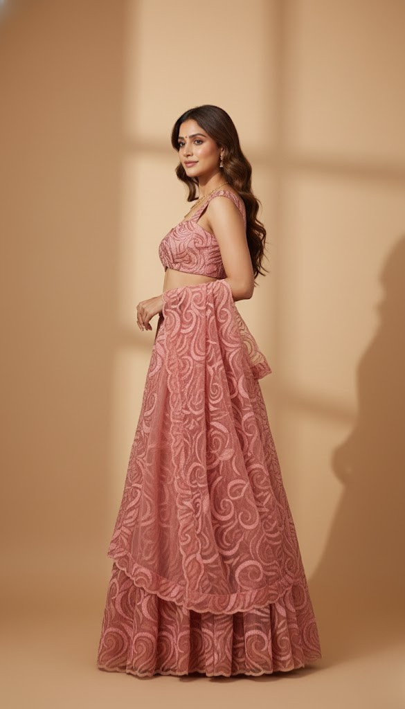 Discover sophisticated elegance with our Blush Pink Abstract Embroidered Lehenga Set. This three-piece ensemble features a beautifully fitted sweetheart-neck crop top and a voluminous tiered skirt crafted from delicate net fabric. The entire set is adorned with exquisite tonal threadwork in a mesmerizing swirling pattern, offering a unique texture and depth.